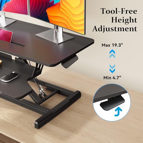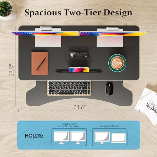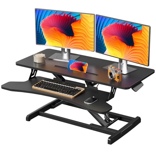Specification: 35 inch Standing Desk Converter, Height Adjustable Desktop Standing Desk with Keyboard Tray for Two Monitors, Sit to Stand up Desk Riser Computer Workstation for Home Office, Black