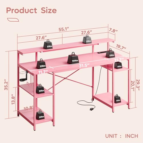 Specification: Bestier Computer Desk with Power Outlets & LED Lights, 55 inch Pink Gaming Desk with Monitor Stand & Adjustable Shelves, Home Office Desk with Cup Holder & Hook, Pink 3D Carbon Fiber