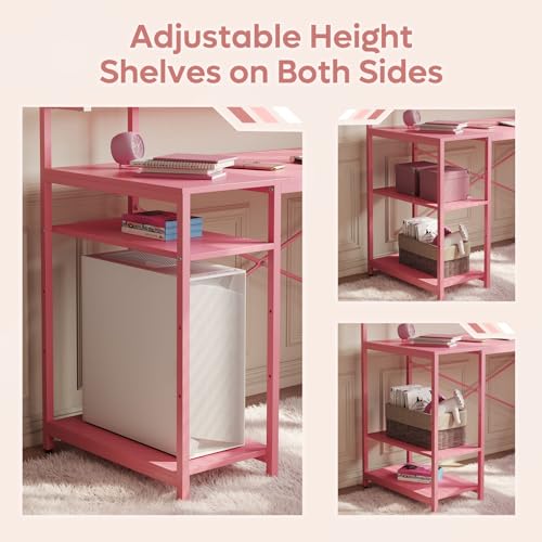 【Flexible Storage Space】This desk with shelves comes with 2 adjustable height shelves, left and right interchangeable foldable cup holder and headphone hook. The shelf on both sides can be adjusted to 3 different heights, allowing you to place your CPU, low file basket, PS5, gaming devices, etc, saving space on your desktop and providing you with a comfortable environment for gaming or working.