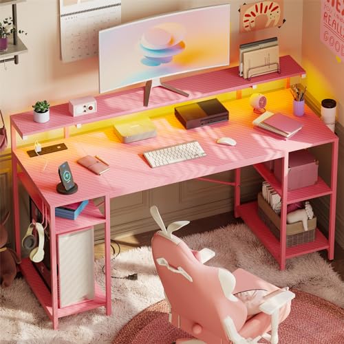 Bestier Computer Desk with Power Outlets & LED Lights, 55 inch Pink Gaming Desk with Monitor Stand & Adjustable Shelves, Home Office Desk with Cup Holder & Hook, Pink 3D Carbon Fiber