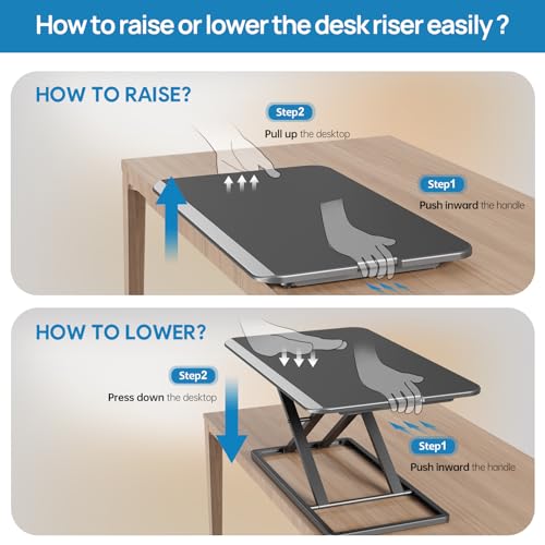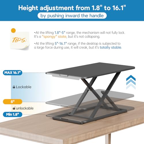 Specification: Compact Standing Desk Converter, 29.3 Inch Height Adjustable Preassembled Stand up Desktop Riser with Exclusive Handle for Laptop, Ultra Low Profile Design