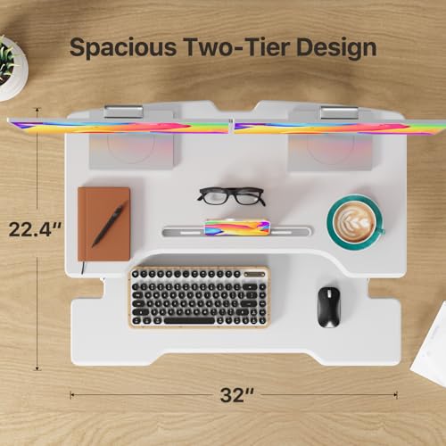 Specification: Standing Desk Converter 32 inch, Height Adjustable Sit Stand Desk Riser, Quick Sit to Stand Tabletop Dual Monitor Riser Workstation for Home Office with Keyboard Tray, White