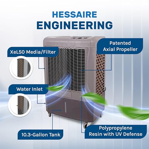 Enjoy Continuous, Quiet Cooling: Molded with a lightweight polypropylene resin, the Hessaire cooler with a 10.3-gallon tank reduces refills thanks to its 80% larger evaporation surface. Its delivery system reduces noise and vibrations for a serene area.