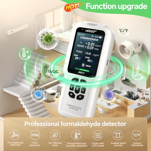 【Multi-function air quality detector】-NOYAFA-JMS17 formaldehyde detector can accurately detect formaldehyde (HCHO), volatile organic compounds (TVOC), temperature, humidity, date and time. It has functions such as silent measurement, backlight LED, real-time measurement, recording measurement, real-time alarm, etc. Before first use or after long-term storage, be sure to place it in a ventilated environment (indoors) for calibration to ensure the accuracy of the data.