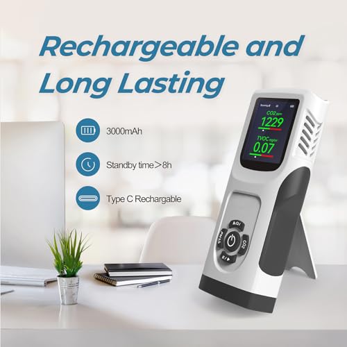 【Rechargeable and Long Lasting】3000mAh Lithium battery that standby time>8h,the air quality tester is used LED screen that easy to read from far away too, automatically goes into sleep mode after 5 minutes to save power, the handheld air quality monitor is also small enough to fit anywhere or travel along with you
