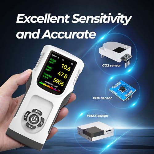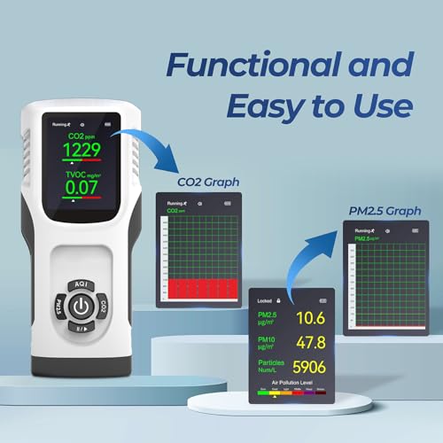 【Functional and Easy to Use】With audible alarm function and the manual is easy to read and take into account, press the AQI button to display the AQI interface, and press it again to mute the sound. Press the CO2 button to display the interface of CO2 and TVOC, press again to display the CO2 graphs. Press the PM2.5 button to display PM2.5, PM10, particle count interface, press again to show the PM2.5 graphs