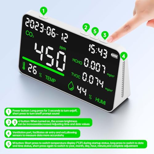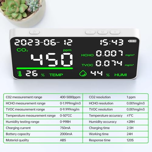 Specification: 7-in-1 Air Quality Monitor, Indoor Humidity Monitor, Temperature, CO2, TVOC, HCHO, Time, Date Display Desktop Air Quality Tester, Air Quality Meters for Home Office Hotel Restaurant School