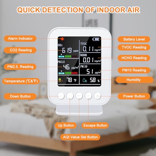 【Protect Your Every Breath】Since clean air means a lot to every one. HARMNHLT Indoor air quality monitor offers accurate monitoring of PM2.5,PM10,CO2, HCHO, TVOC, temperature and humidity, all displayed on utral-high definition color screen for people easy to identify and read. With its convenient design, you can monitor the environment at any time and it efficiently measures 7 crucial indexes for evaluating air quality.