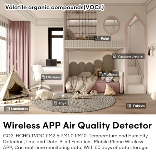 Specification: 9-in-1 Indoor Air Quality Monitor: Detects PM2.5, PM1.0, PM10, CO2, CO, TVOC, HCHO, Temperature & Humidity for Home, Office, School & Hotel