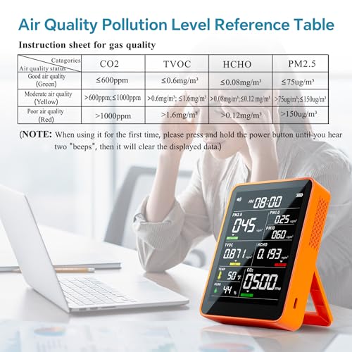 Specification: 9-in-1 Professional Indoor Air Quality Monitor PM2.5/PM10/CO2/Temperature/Formaldehyde Detector/Humidity TVOC/Time Display Air Quality Tester for Home Office School Portable Air Quality Tester