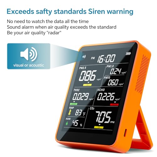 【Multifunctional & Easy to Read】Since clean air means a lot to every one. PinoTec Indoor air quality monitor offers accurate monitoring of PM2.5,PM10,CO2, HCHO, TVOC, time,temperature and humidity, all displayed on utral-high definition color screen for people easy to identify and read. With its convenient design, you can monitor the environment at any time and it efficiently measures 8 crucial indexes for evaluating air quality.