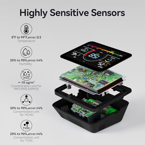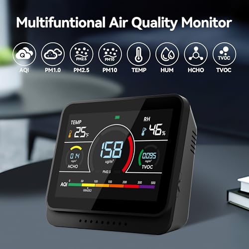 Specification: Air Quality Monitor Indoor for Home, 13-in-1 PM1/PM2.5/PM10/TVOC/Formaldehyde/Temp/Humidity and 6AQI Tester, Portable & Easy to Use, Highly Accurate Air Quality Meter for School, Office (Black)