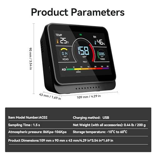 COMPACT SIZE & PACKAGING: 109x90x43 mm/4.29×3.54×1.69 inch, this air quality monitor is compact and lightweight, making it convenient for shuttle. The package includes 1 x air quality monitor, 1 x USB cable, and 1 x user manual.Upon getting this, you want to tear off the protective film of the screen and then you’ll use it usually!