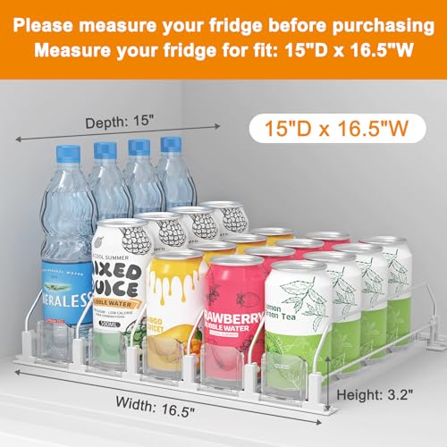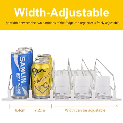 【Adjustable Width & Large Capacity】The width between the two partitions of the refrigerator can organizer can be adjusted freely, which makes the soda can dispenser fit most standard-size beverage bottles and cans (12 oz, 16 oz, 16.9 oz, 20 oz, etc.).