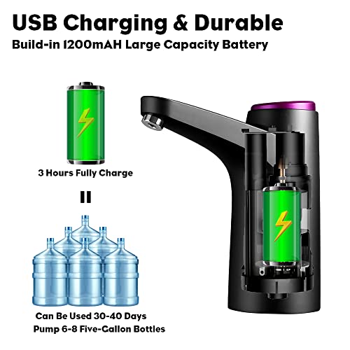【Long Battery Life】Our electric water pump has build-in 1200mAh rechargeable battery, strong endurance. It may be used for 30 days or about 8 bottles of 5 gallons of water after being fully charged, and the general usb interface can charge it