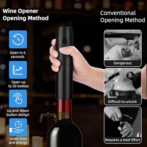 Easy to operate: The automatic wine bottle opener removes cork quickly and easily in 5-7 seconds. The wine opener electric revolutionizes the hassle of manually removing cork,It is both convenient and efficient.