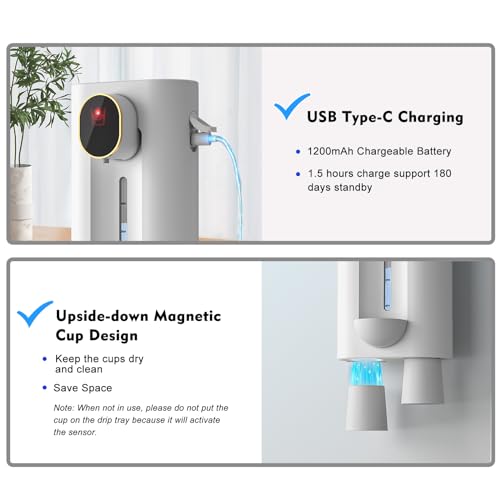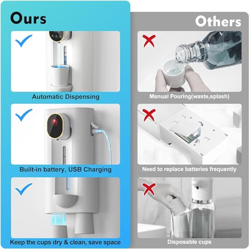 【USB RECHARGEABLE MOUTHWASH DISPENSER】Compared with other auto mouthwash dispensers in the marketplace, we made it with built-in 1200mAh battery instead of the AAA battery operated. Our product is more convenient and cost-effective, 1.5 Hours Charge Toughen 180 Days Standby. Stop wasting time & money on replacing the AAA batteries.