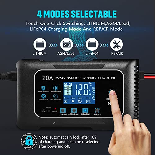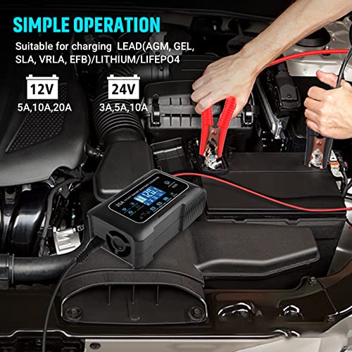 20-Amp Lifepo4 Lithium AGM Gel Smart Battery Charger, 12V/20A 24V/10A Trickle Charger, Maintainer for car Boat Motorcycle, Lawn Mower