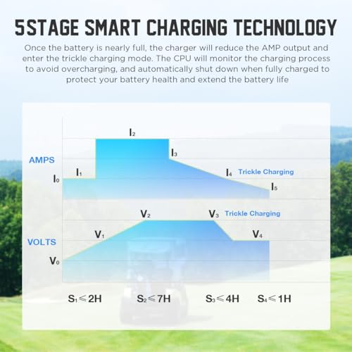 【48V 18A Golf Cart Fast Charger】Our 48V charger provides 18A fast charging speed, which can fully charge a 100AH lead-acid battery in about 6 hours, saving 4 hours than a 10A speed charger. It uses advanced 5-stage smart charging technology.When battery is nearly full, the charger reduces AMP output and enters trickle charging mode.The CPU will monitor the charging process to avoid overcharging and automatically shut down when fully charged to protect your battery health and extend battery life.