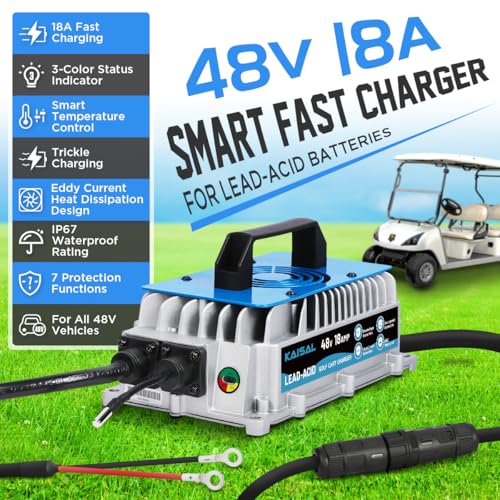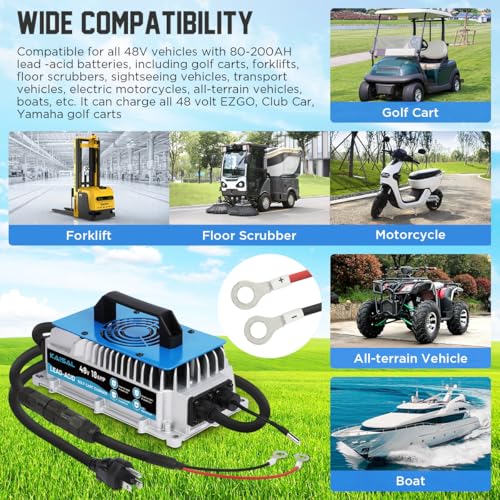 Specification: KAISAL 48V Charger 1250W 18A Golf Cart Battery Charger for 48 Volt Club Car/EZGO/Yamaha Onboard Lead-acid Golf Cart Charger with M8 Terminal for all 48V Vehicles, Forklift, Floor Scrubber, Motor, Boat