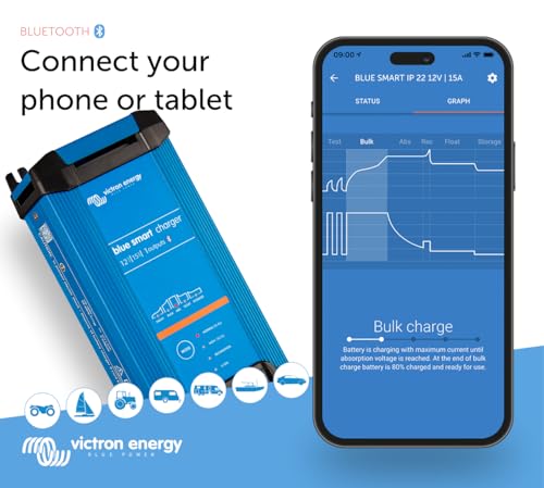 Specification: Victron Energy Blue Smart IP22 Smart Car Battery Charger 12V 15A, Trickle Charger, Float Charger and Desulfator for Motorcycle, ATV, RV, Lithium and Deep Cycle Batteries
