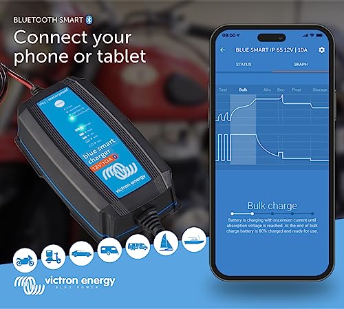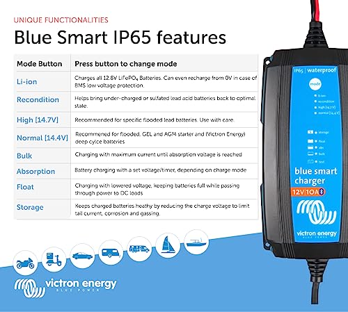 Specification: Victron Energy Blue Smart IP65 Smart Car Battery Charger 12V 10A, Trickle Charger, Float Charger and Desulfator for Motorcycle, ATV, RV, Lithium and Deep Cycle Batteries