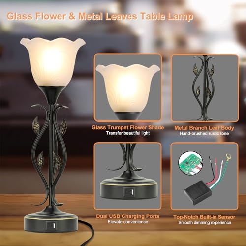 Bedside Lamps Set of 2, Table Lamp with USB Port 3 Way Dimmable Touch lamp Torchiere Nightstand Lamps with Rustic Vines Leaf and Glass Flower Shade lamp for Bedroom, Living Room, Office