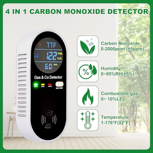 𝟒-𝐢𝐧-𝟏 𝐂𝐚𝐫𝐛𝐨𝐧 𝐌𝐨𝐧𝐨𝐱𝐢𝐝𝐞 𝐃𝐞𝐭𝐞𝐜𝐭𝐨𝐫:Plug in multi-function carbon monoxide detector can monitor the current air CO and combustible gas concentration, humidity and temperature in real time,making it an ideal safety tool for both home and shuttle.The CO Detector Range: 0~2000PPM (±5%PPM), Gas Detector Range:0~ 10%LEL,Humidity Range: 0%~99%RH (±5%RH),Temperature Range: 1~176 ℉(±4℉).