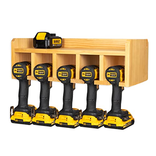 Compact Power Tool Organizer – Fully Assembled Wood Drill Storage Rack and 5 Drill Charging Station – Great Workshop Organization and Storage Gift for Men