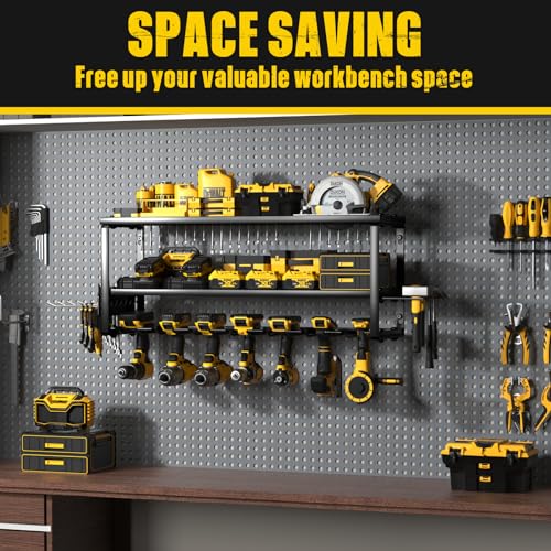 【HEAVY DUTY】:This tool holder is made of heavy compact steel metal, and the joint of the shelf uses a reinforced design. With plenty of load-bearing testing, our tool storage rack can hold your power tools of any weight