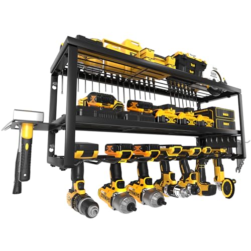 Specification: Heavy Duty Power Tool Organizer Wall Mount, Storage Rack for Garage Organization, Cordless Drill Holder and Battery Shelf, Metal Tool Organizers with Charging Station