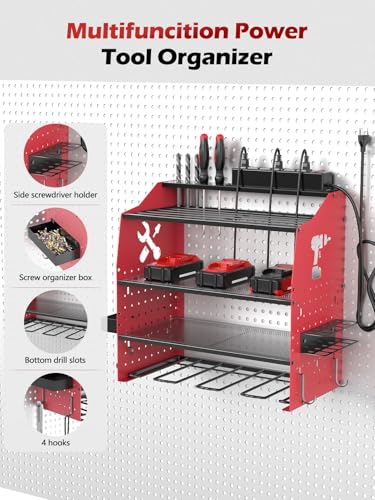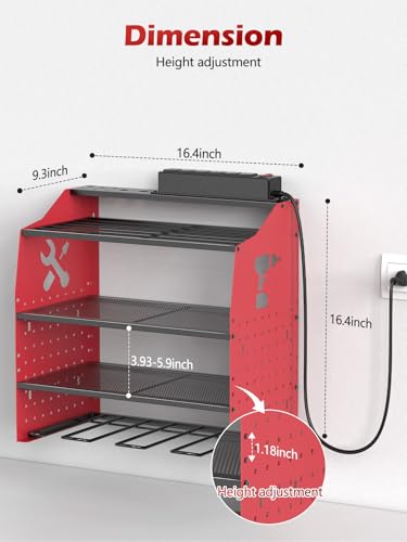 【Height adjustment Garage Tool Organizer】The power tool organizer wall mount provides versatile storage with adjustable shelf heights to keep your tools neatly organized. The bottom shelf is designed to hold up to 4 cordless drills, whilst 4 sturdy hooks provide extra space for hanging wrenches, screwdrivers, or other tools. The three middle tiers offer customizable storage for larger tools or accessories, and the side includes a dedicated screwdriver holder and screw organizer box. The top shelf features a built-in power outlet for added convenience, making it easy to charge your tools (Tools shown in images aren’t included)