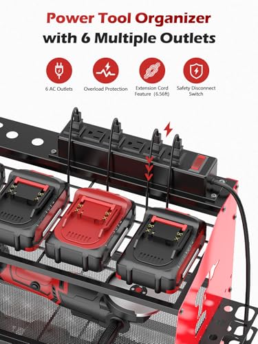 【Efficient Power Tool Storage】 The power tool organizer with charging station is designed to bring order and convenience to your workspace. Featuring a 6-outlet charging station with a 6.56ft power cord, this 4-tier wall mount seamlessly combines tool storage and power get admission to. The integrated design permits you to charge or power your tools immediately at the rack, reducing cable clutter and creating an efficient, organized environment