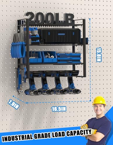 【Heavy Duty Design】Thickened and reinforced power tool rack will help you load up to 200 pounds of tools using all 4 wall anchors. Equipped with hexagonal expansion bolts to withstand greater loads, never worry about the rack breaking or the tool rack falling up and down from the wall.