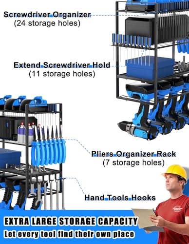 【Storage Upgrade】This wall mounted power tool organizer features the latest four tier high capacity design. The bottom tier can store 4 cordless drills, the top three tiers can store other heavy-duty tools or numerous small tools, and the side adds a hammer holder, pliers holder and screwdriver holder.