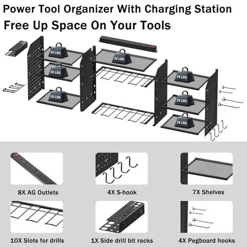 Specification: Power Tool Organizer Wall Mount with 6FT Cord And 8 Outlet Power Strip Tool Charging Station 8 Drill Tool Holder Cordless Tool Rack Garage Tool Storage for Garage Organization (Black, 6FT Cord)
