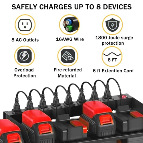 power tool charging station: with individual 8 outlets power strip and a 6 FT power, cord All-in-one design and the metal power strip with Overload protection switch And equipped, Can effectively protect your tools.