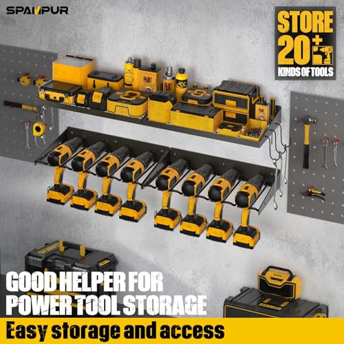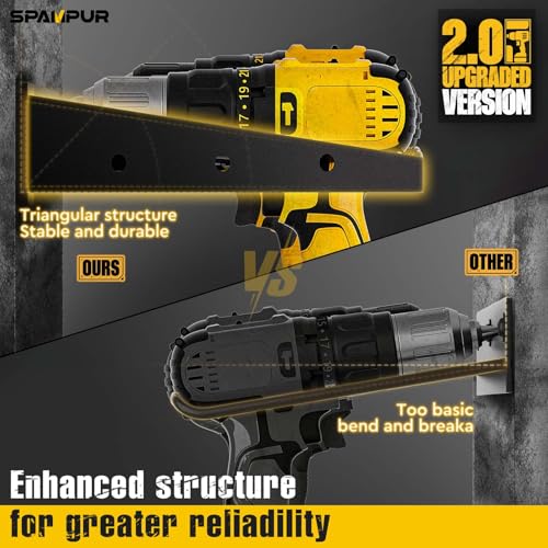 2.0 Upgraded Version: The power tool storage rack includes 2 battery charging stations and 8 drill slots. The safety guardrail is added on both sides of the tool holder, and the triangular guardrail structure makes its products more stable and durable. Your handheld tools, batteries, and screwdrivers can be placed on the upper level, and the lower level drill rack can store various brands of drills