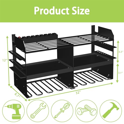 8 Drill Holders with Super-Capacity Design: Our power tool organizer wall mount has 8 drill holders, 2 railings at the top, a double-sided bracket, and a middle partition that can accommodate chargers or spare batteries.Additionally, a hammer holder, pliers holder, wrench storage holder, and screwdriver holder are included on the side, providing ample storage space for your entire on a regular basis tool storage needs