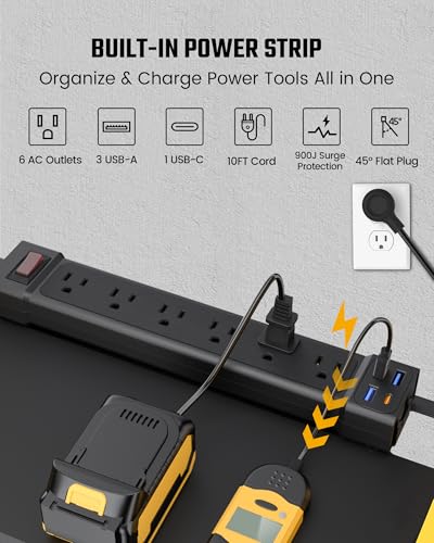 BUILT-IN 6 AC 4 USB POWER STRIP: The top tier includes a built-in 10ft power strip with 6 AC outlets and 4 USB ports (1 USB-C), so you can charge your power tool batteries while they’re stored—no more searching for wall outlets. The power strip has 900J surge protection to safeguard your devices from electrical surges and power spikes, along with a 10A/1250W circuit protector to prevent overloads or short circuits.