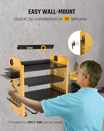 QUICK-CLIP 10 MIN INSTALLATION: The SUPERDANNY garage tool organizer features a QuickClip wall mount system that makes installation a breeze. Simply attach the mount to the wall (leveling tool included), hang the assembled organizer, and secure it with four screws. You can complete the entire installation in about 10 minutes, using just basic tools and following the provided instructions, by only ONE PERSON.