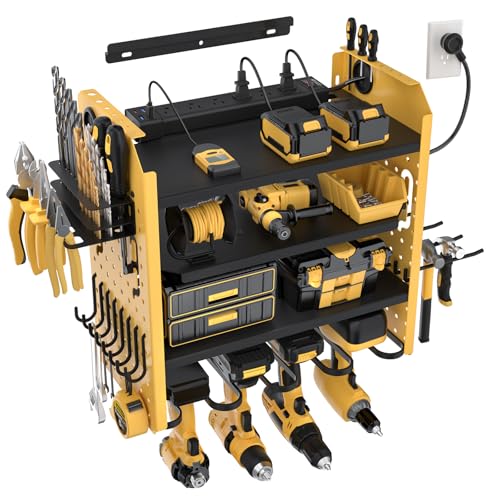 Specification: SUPERDANNY Power Tool Organizer Wall Mount with Charging Station, Adjustable 4-Tier 4 Drill Storage Shelf Garage Organization, Cordless Drill Hanger Tool Battery Holder Storage Rack with 6 AC 4 USB