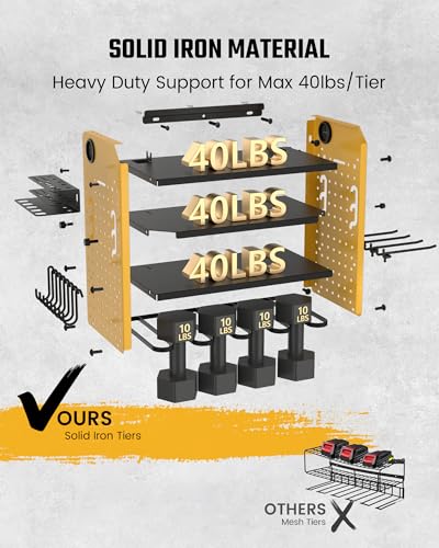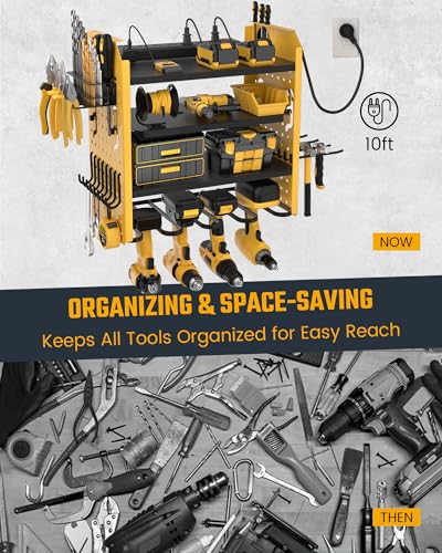 40LBS/TIER HEAVY DUTY SUPPORT: Constructed from thickened iron plates and screws, this 4-tier power tool organizer with charging station supports heavy tools up to 40lbs per tier, making it sturdier than other grid-tier options. It’s compatible with wood, concrete, drywall, or pegboard, making it an ideal addition to your garage, basement, workshop, workbench, or repair desk. It also makes a great gift for birthdays, Father’s Day, Christmas, or anniversary.