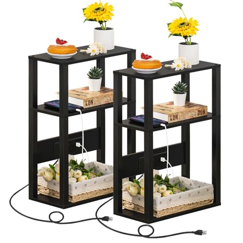 3-Tier Small Narrow Wood Side Table Set of 2 with Charging Station – Skinny Nightstand for Small Spaces, Slim Bedside Table with USB Ports and Outlets – Thin End Table with Storage, Black