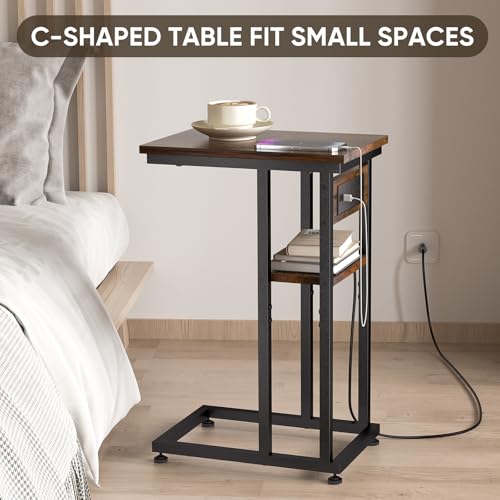 BALEINE Side Table with Charging Station, C-Shape End Table with Dual USB-C Ports and Outlets, Couch Table, Bedside Table for Small Spaces, Living Room, Bedroom (Rustic Brown)