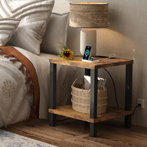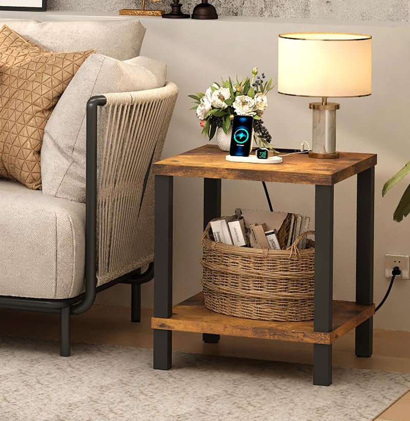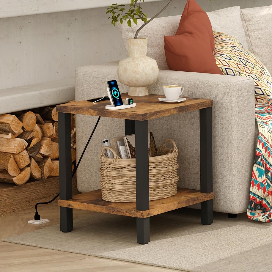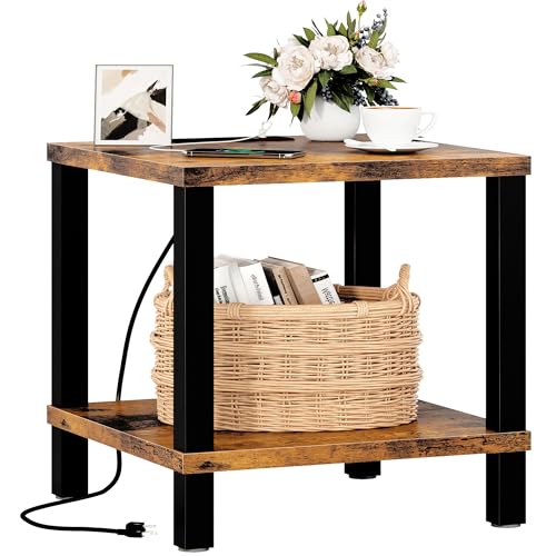 End Table with Charging Station, 20 Inch Square Side Table with USB Ports & Power Outlets, No Tools Required to Assemble, for Living Room, Bedroom, Stable Frame,Rustic Brown XXCTG04RE