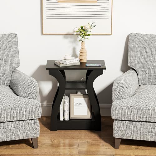 Specification: End Table with Charging Station, Side Table with USB Ports and Outlets, Nightstand, 3 Tier End Table with Storage Shelf for Living Room, Bedroom (Black)