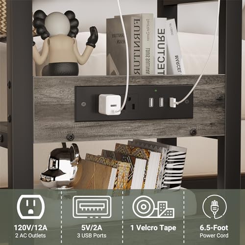Height Adjustable End Table with Charging Station, Mobile C Shaped Laptop Side Table with Wheels, 3-Tier Sofa Couch Table with Storage Shelve for Living Room Bedroom, Grey Oak