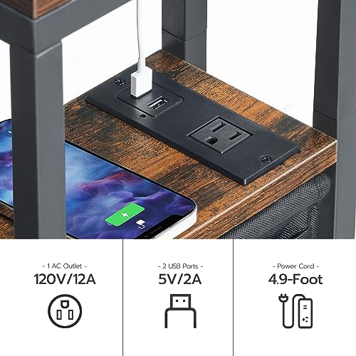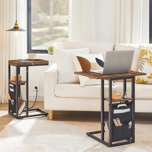 HOOBRO C Shaped Side Table with Charging Station, Foldable End Table with Storage Bag, Sofa Couch Table Snack Table for Small Space in Living Room, Bedroom, Rustic Brown and Black BF101USF01