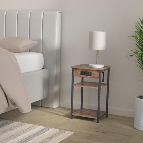 Specification: Rolanstar End Table with Charging Station, Night Stand with 3 Storage Shelves, Narrow Side Table with USB Ports & Power Outlets, Small Bedside Table for Living Room, Bedroom, Rustic Brown, Set of 2